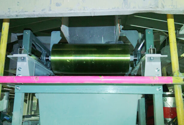 ベルト張力と摩擦力を利用してリターン側ベルトの蛇行を修正するアイドラです。
