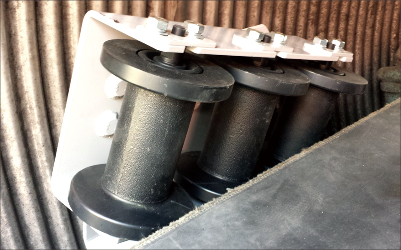 A slight tilt of the guide in the belt traveling direction generates a downward pushing force (thrust), which makes use of the mistrack adjustment principle that the belt returns to the center of the conveyor so that it slides along the trough.