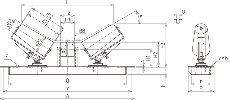 JAC-T 型と同様にサイドローラがテーパ型の自動調芯キャリヤアイドラです。蛇行調整機能の発生原理も同様ですが、構造の違いとして、左右のローラ受の下部それぞれに旋回軸を配置し、旋回フレームを無くすことで、旋回感度を向上させています。当製品も、正逆運転コンベヤでの使用が可能です。